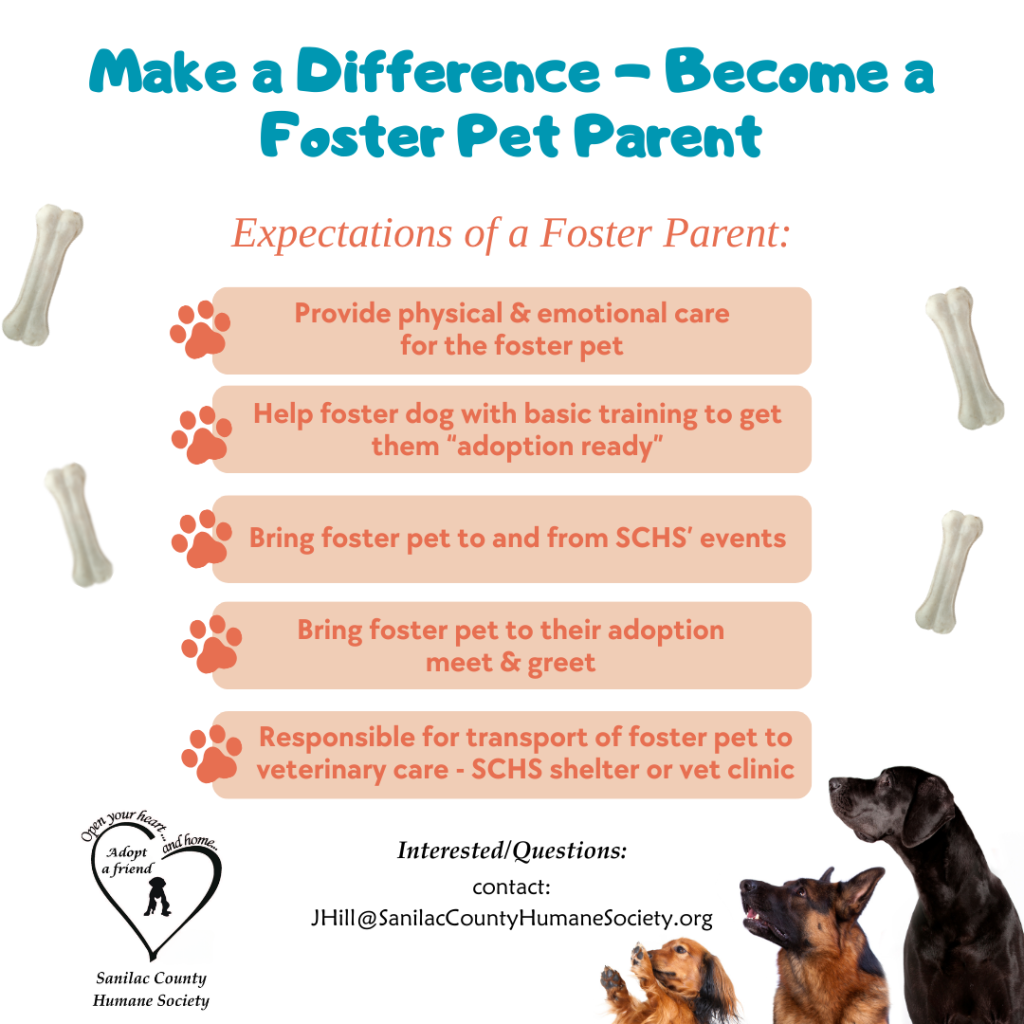 We are looking for Foster Parents/Families! Complete this Foster Application and submit to: JHill@SanilacCountyHumaneSociety.org